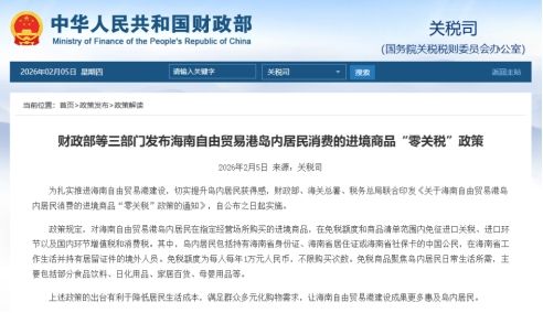 新华财经北京2月5日电 据财政部网站5日消息,为扎实推进海南自由贸易港建设,切实提升岛内居民获得感,财政部、海关总署、税务总局联合印发《关于海南自由贸易港岛内居民消费的进境商品“零关税”政策的通知》,自公布之日起实施。