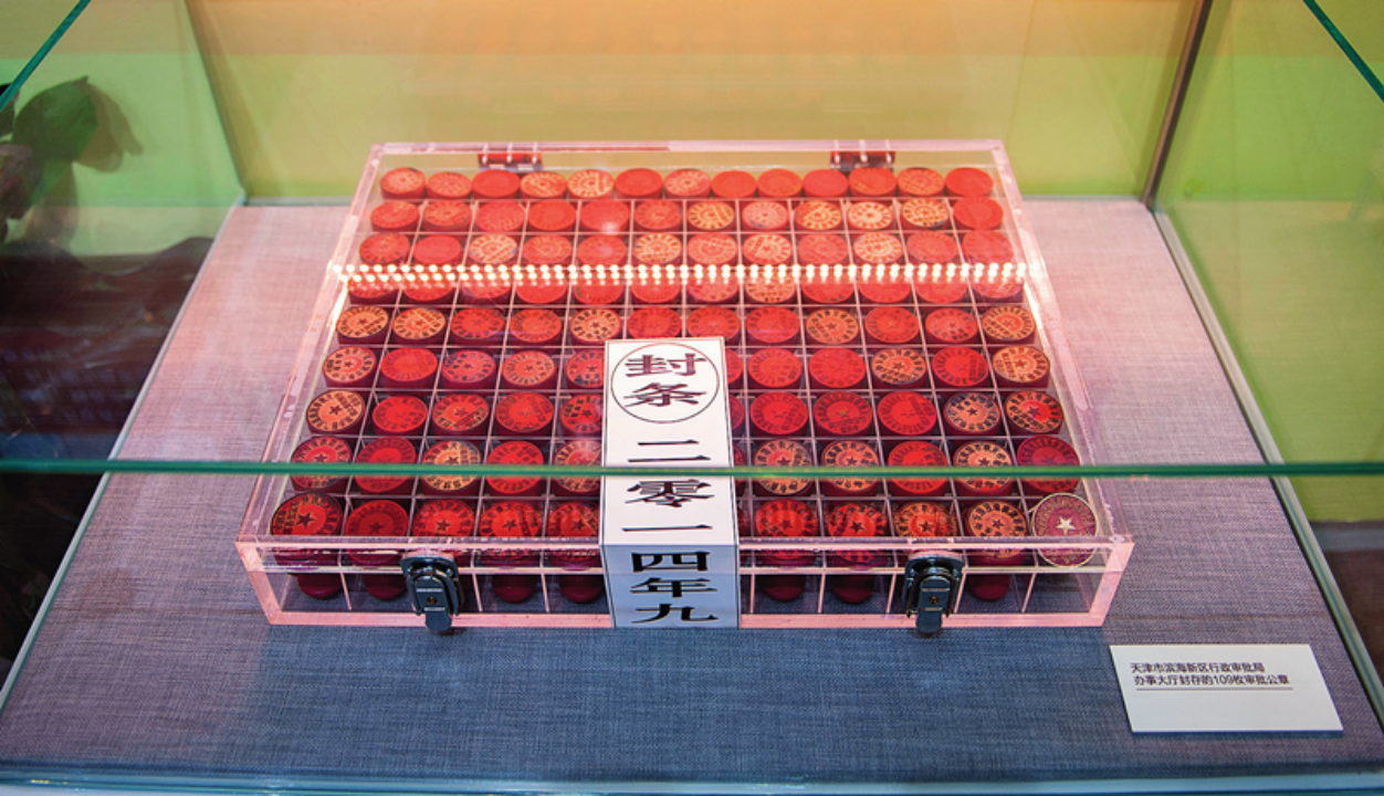 2014年5月,滨海新区依法组建全国首家行政审批局,将原本分散在18个单位的216项审批职责归至一个部门,率先实现“一枚印章管审批”。2014年9月,滨海新区将这109枚公章封存。2014年11月,这109枚公章被中国国家博物馆收藏。资料照片/新华社发