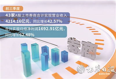 10月30日晚间,A股上市券商三季报全部披露完毕(此次统计新增“国盛证券”)。据《证券日报》记者统计,前三季度,43家A股上市券商合计实现营业收入4214.16亿元,同比增长42.57%;合计实现归母净利润1692.91亿元,同比增长62.48%,业绩增长态势强劲。